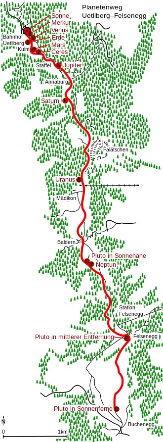 ![]() | Ende Astralreise 7,5 km von Felsenegg bis Uetliberg auf dem Planetenweg. Auf Australreise von Pluto bis Sonne aber 7’500’000 km im Sonnensystem im Weltall unterwegs! |